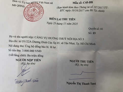 Sau khi triển khai, tập thể Đại diện Cảng vụ ĐTNĐ số 3 đã tiến hành đóng góp hỗ trợ bằng tiền mặt với tổng số tiền ủng hộ thu được là 3.000.000 đồng (Ba triệu đồng). Ngày 25/11/2025, Đại diện đã liên hệ trực tiếp và trao số tiền quyên góp được cho Ủy ban mặt trận Tổ quốc xã Tân Nhựt, Thành phố Hồ Chi Minh